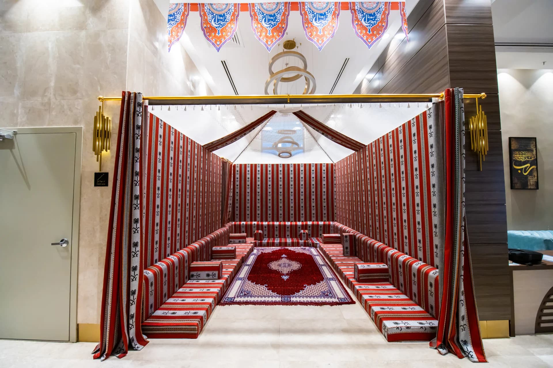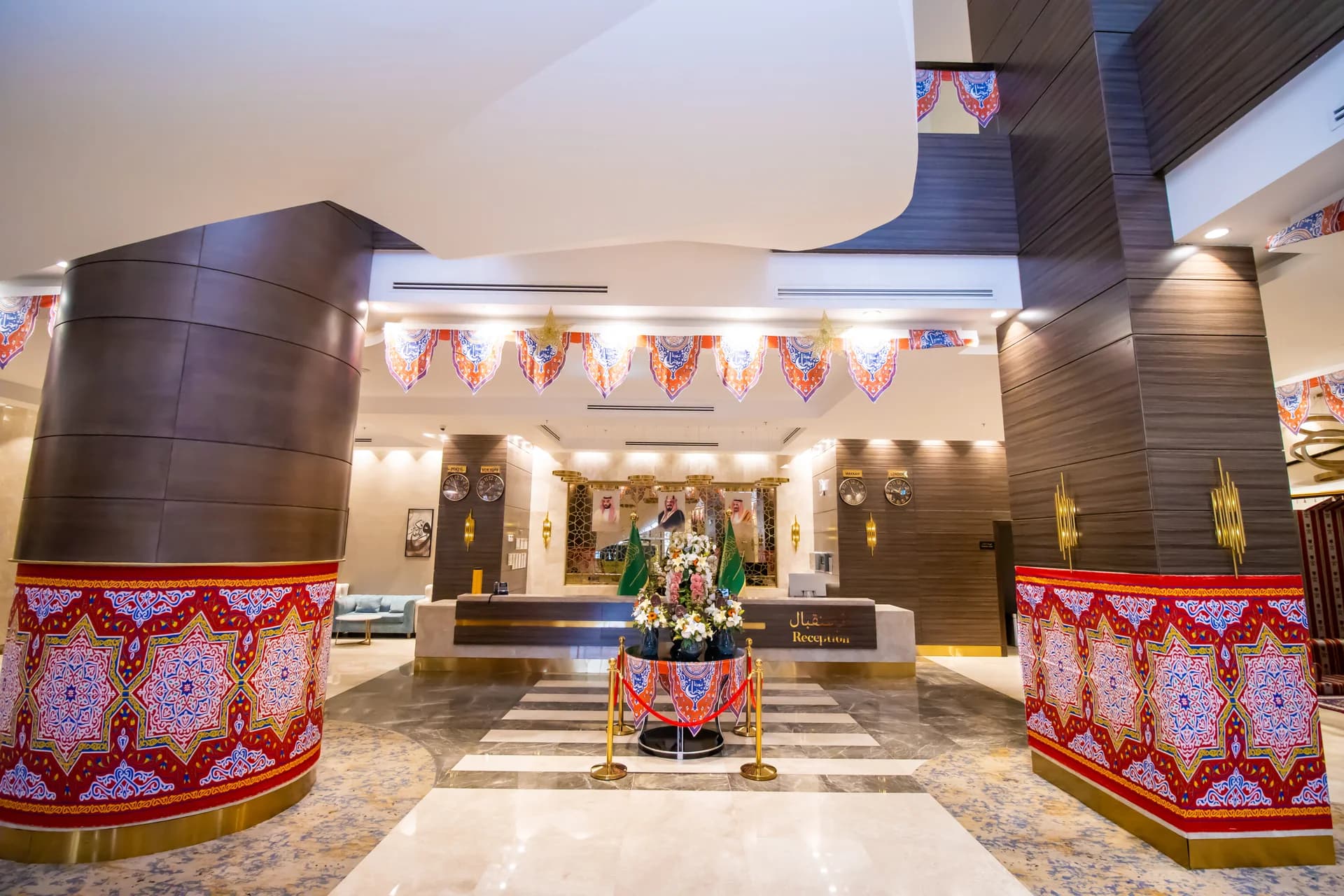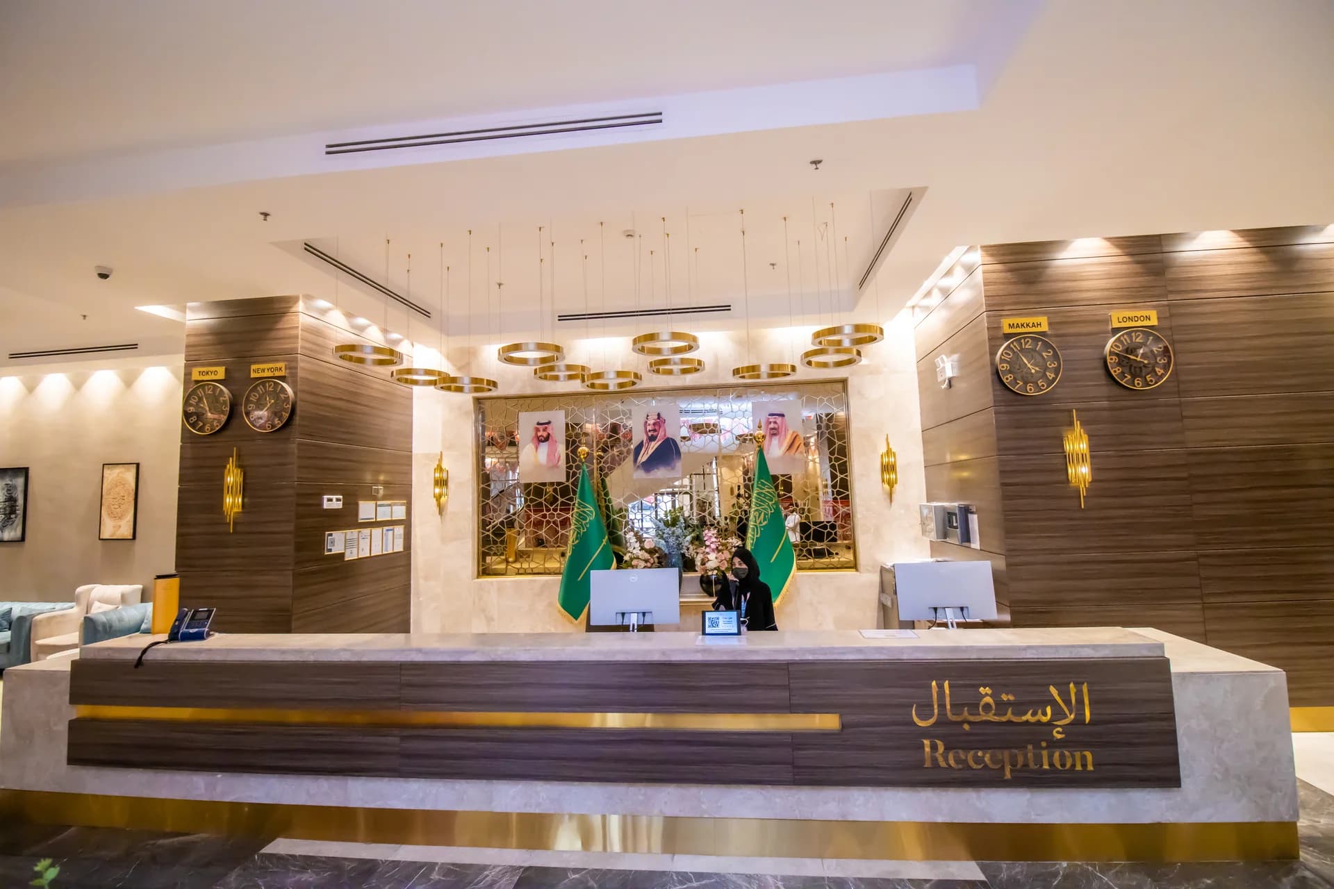 فندق بتصميم رخامي ذهبي مع لوبي فسيح وقاعة طعام كبيرة ومصلى